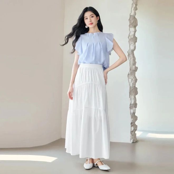 蕾丝领或荷叶边装饰的娃娃衫与A字半身裙是天生一对。尝试柔和的马卡龙色系组合,如薰衣草紫配奶油白。将娃娃衫妥帖束进裙腰,强调比例,裙长及膝或小腿更显优雅。